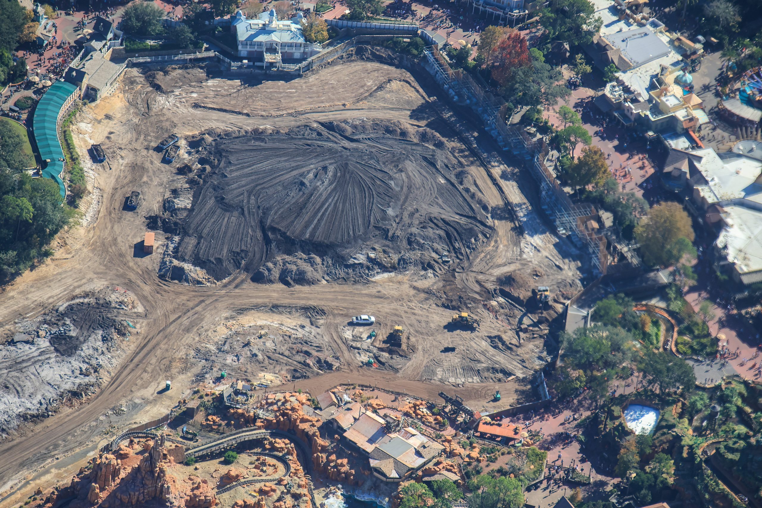 This photo shows another angle of the aerial overview. You can see the construction taking place for Piston Peak National Park between Big Thunder Mountain Railroad and Liberty Square. As for Villains Land, that’s in the majority of the cleared acreage.