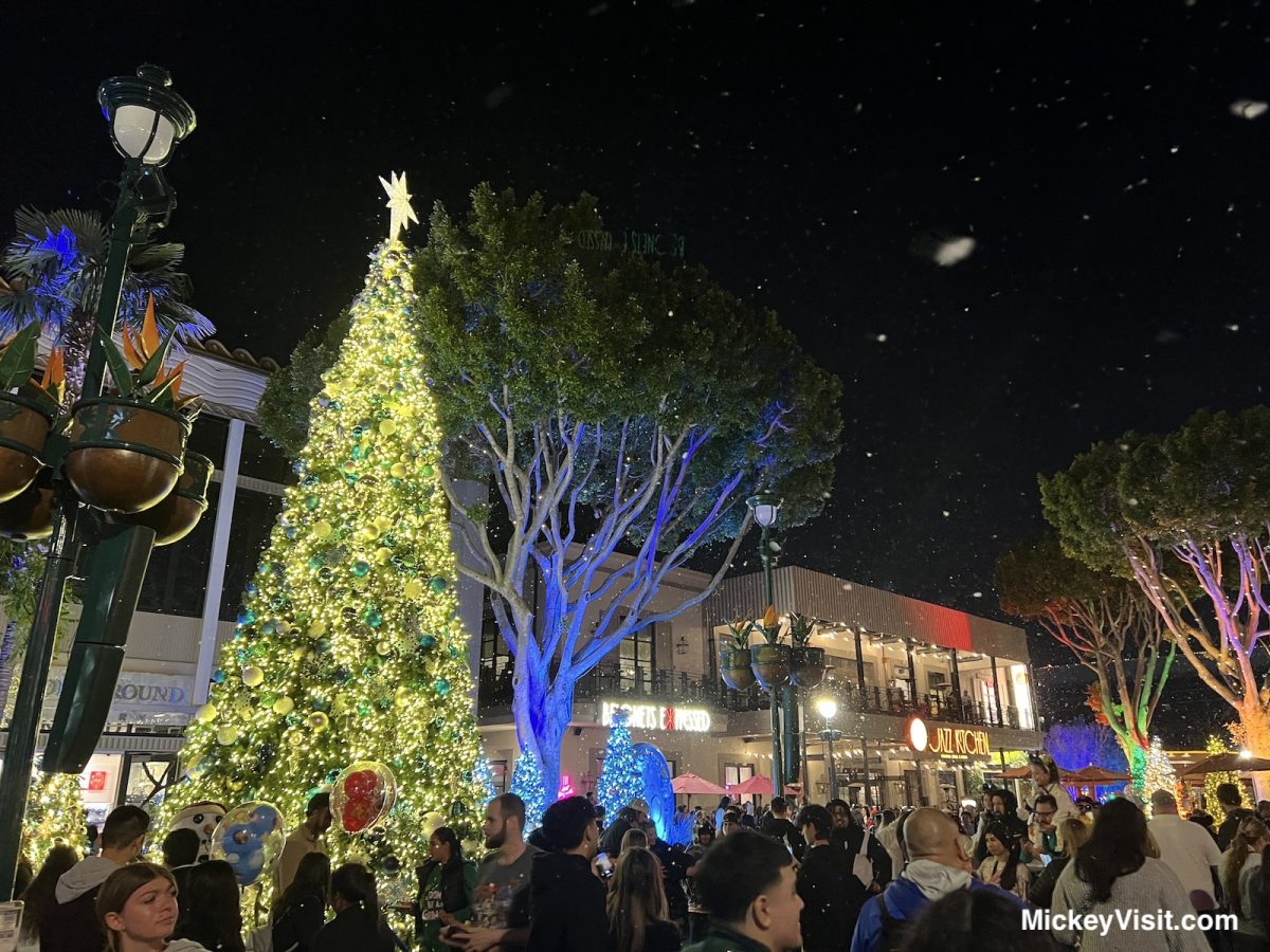 Downtown Disney is magical at night during the holidays! It’s worth taking some time to stroll through and enjoy the holiday trees, lights, and Christmas displays in the shop windows. In the evenings, you can enjoy nightly show moments several times throughout the night. Snowfall happens at 6:00 pm, 6:40 pm, 7:20 pm, 8:00 pm, 8:40 pm, 9:20 pm, and 10:00 pm daily.