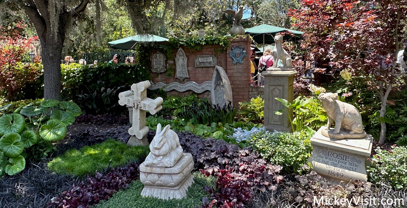 Just off to one side of the Haunted Mansion attraction, there is a small cemetery set up with some interesting gravestones. This cemetery is dedicated to some important members of the family—the pets! Take some time to look at and read the various headstones, and you'll learn why this cemetery isn't just for cats and dogs. Buried there are also a rabbit, a pig, and several other unique family pets.