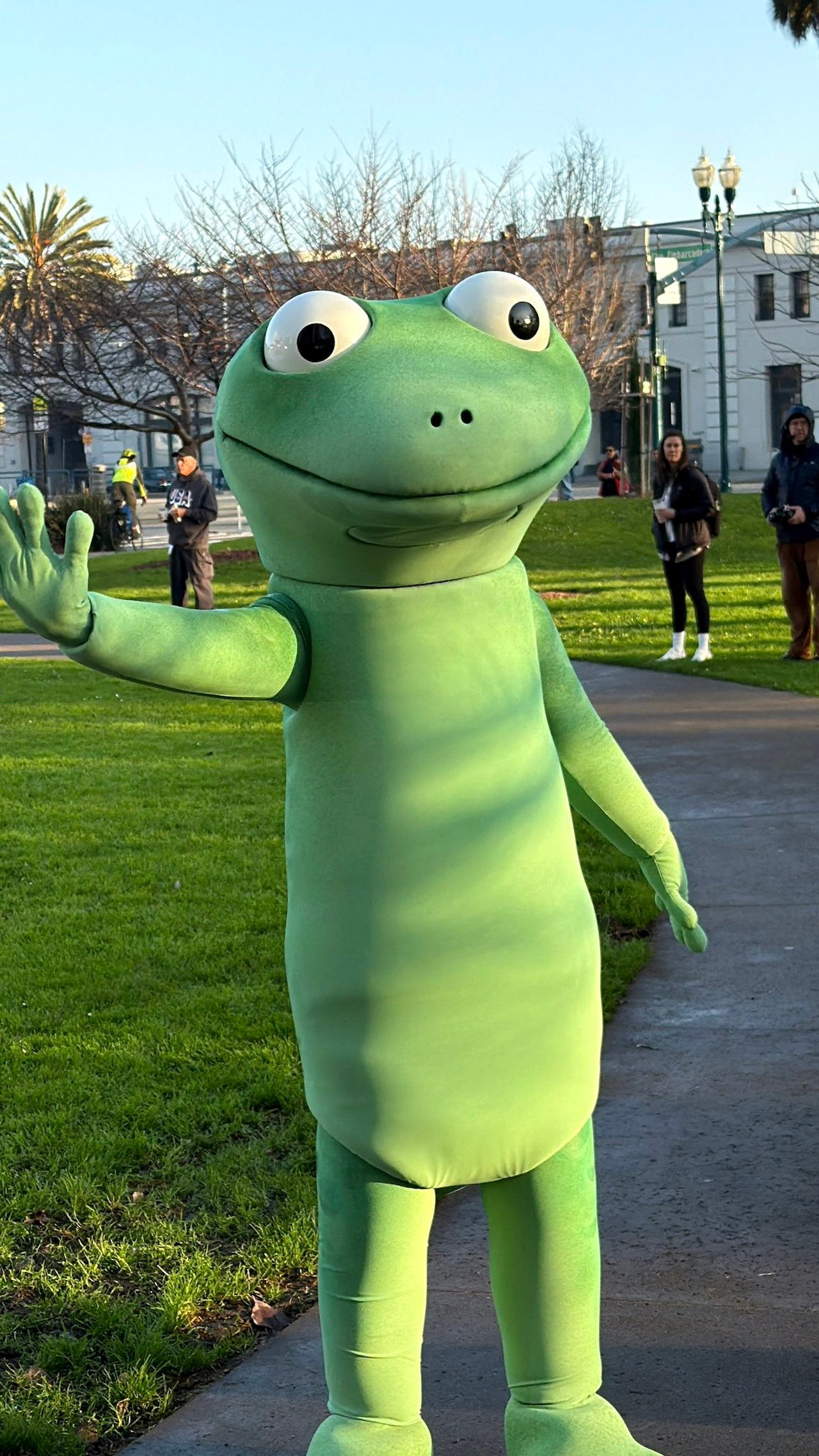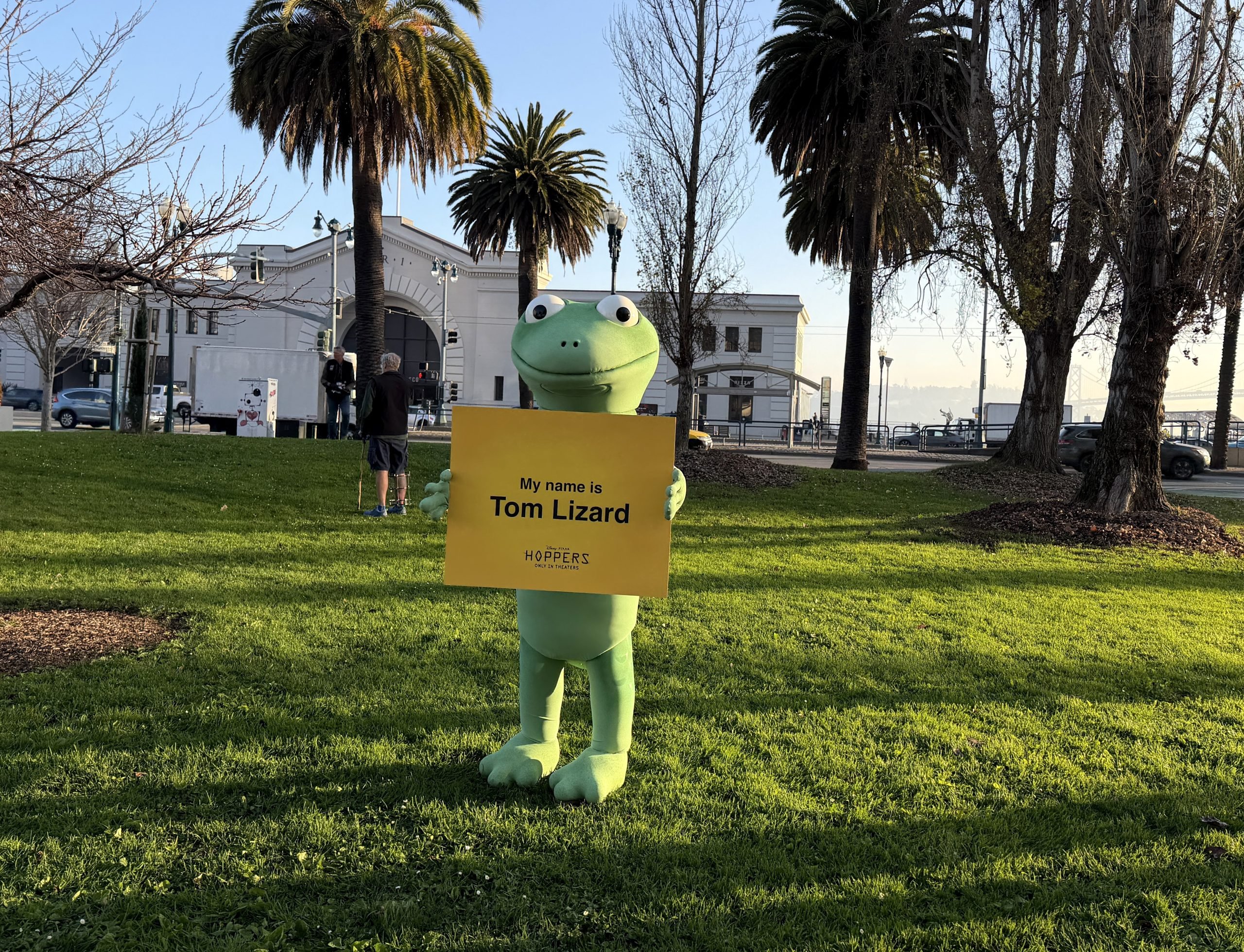 Tom Lizard was spotted by the Laughing Place walking around in San Francisco during ESPN’s First Take broadcast. He was seen holding signs that said “My name is Tom Lizard.” and “Has anyone seen Jon Hamm?” He stopped to take photos with fans and was caught in the back of ESPN’s broadcast for what we assume was planned marketing for the new film, Hoppers.